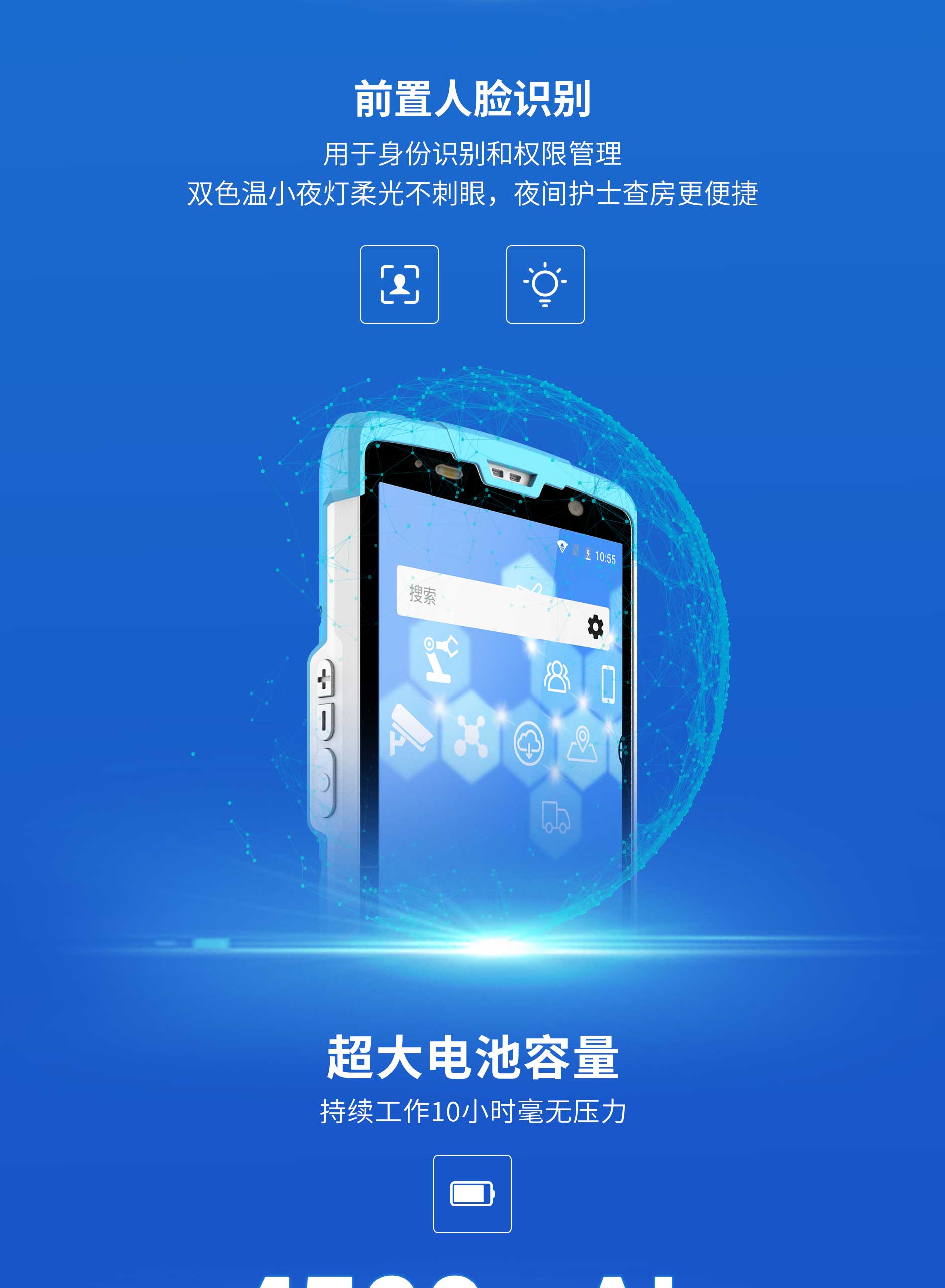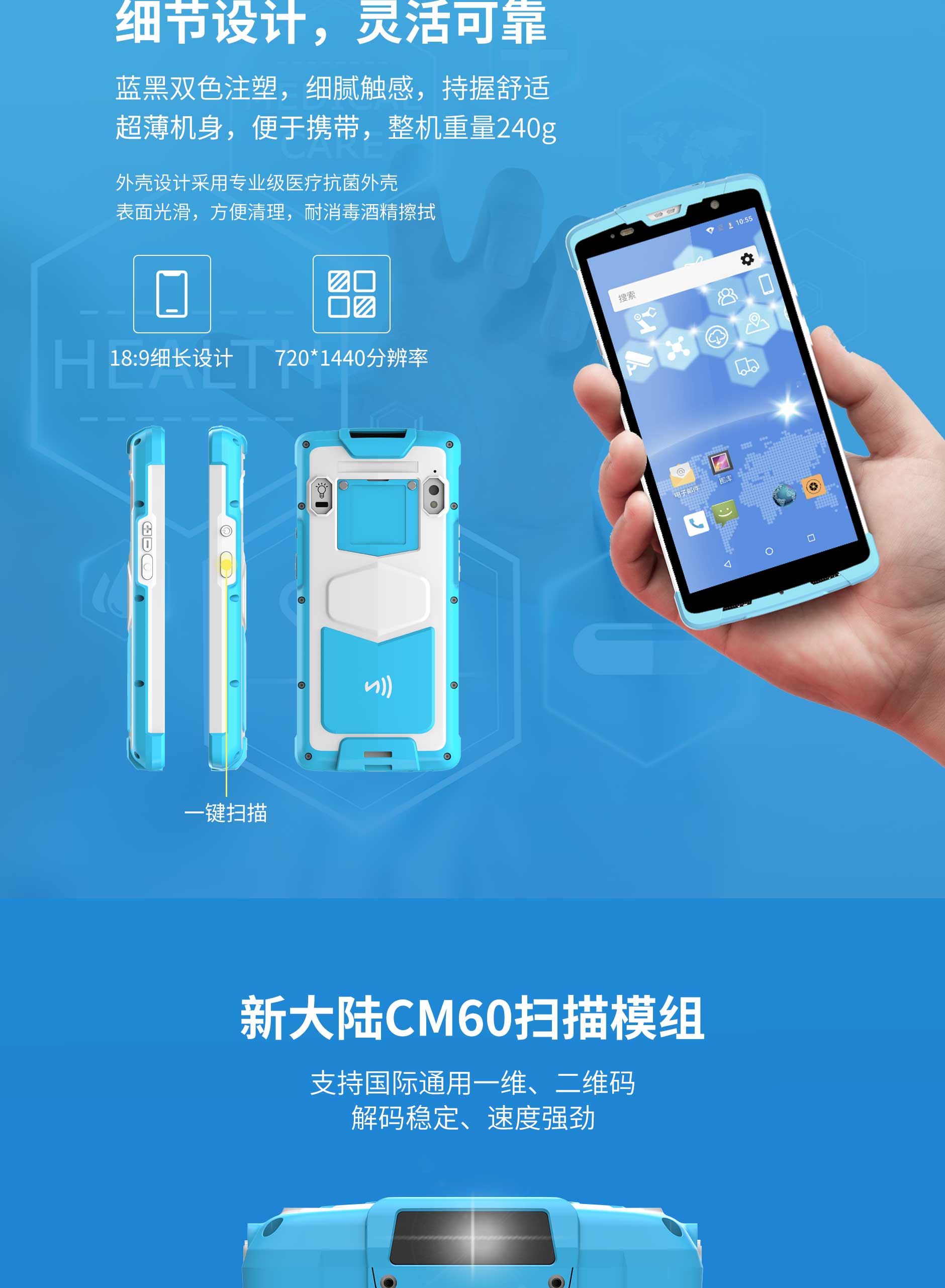 思必拓SD55MD醫(yī)療手持終端SD55MD 基本參數(shù)處理器8核 2.0GHz操作系統(tǒng)Android 8.1存儲(chǔ)RAM:4GB ROM :64GB屏幕尺寸5.5寸 IPS高亮屏機(jī)器尺寸150*72.5*15mm重量240g攝像頭后置1300萬(wàn)自動(dòng)對(duì)焦攝像頭;高亮度LED閃光燈,前置500萬(wàn)定焦攝像頭音頻前置雙立體聲揚(yáng)聲器,音量90db±3db(測(cè)試距離10cm)傳感器地磁,加速,光感距離按鍵2個(gè)