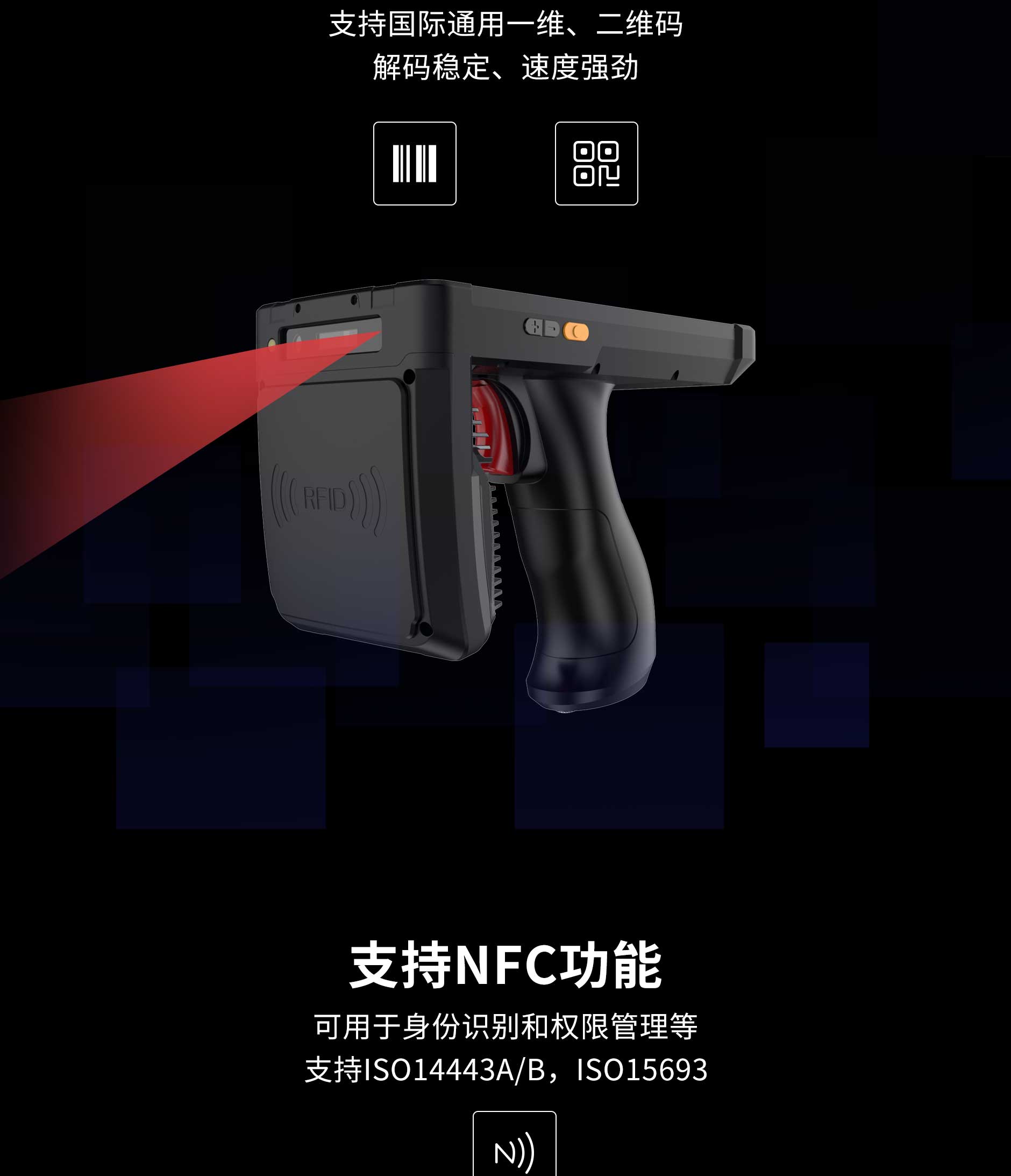 NFC | 支持協(xié)議:ISO14443A/B,ISO15693,讀取距離:0~5cm |