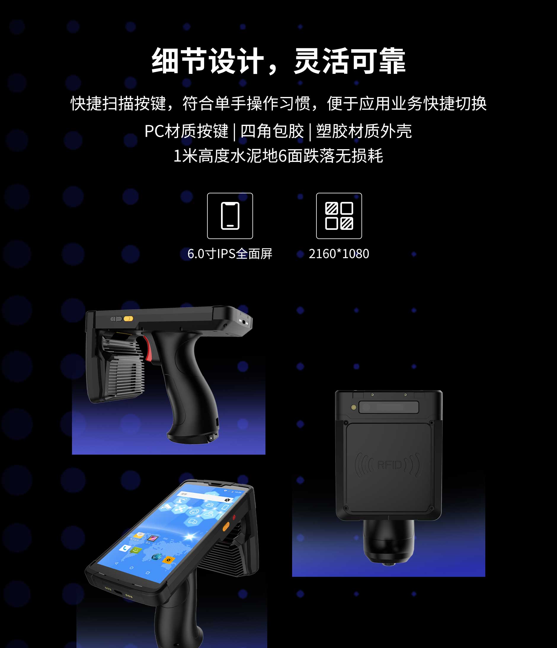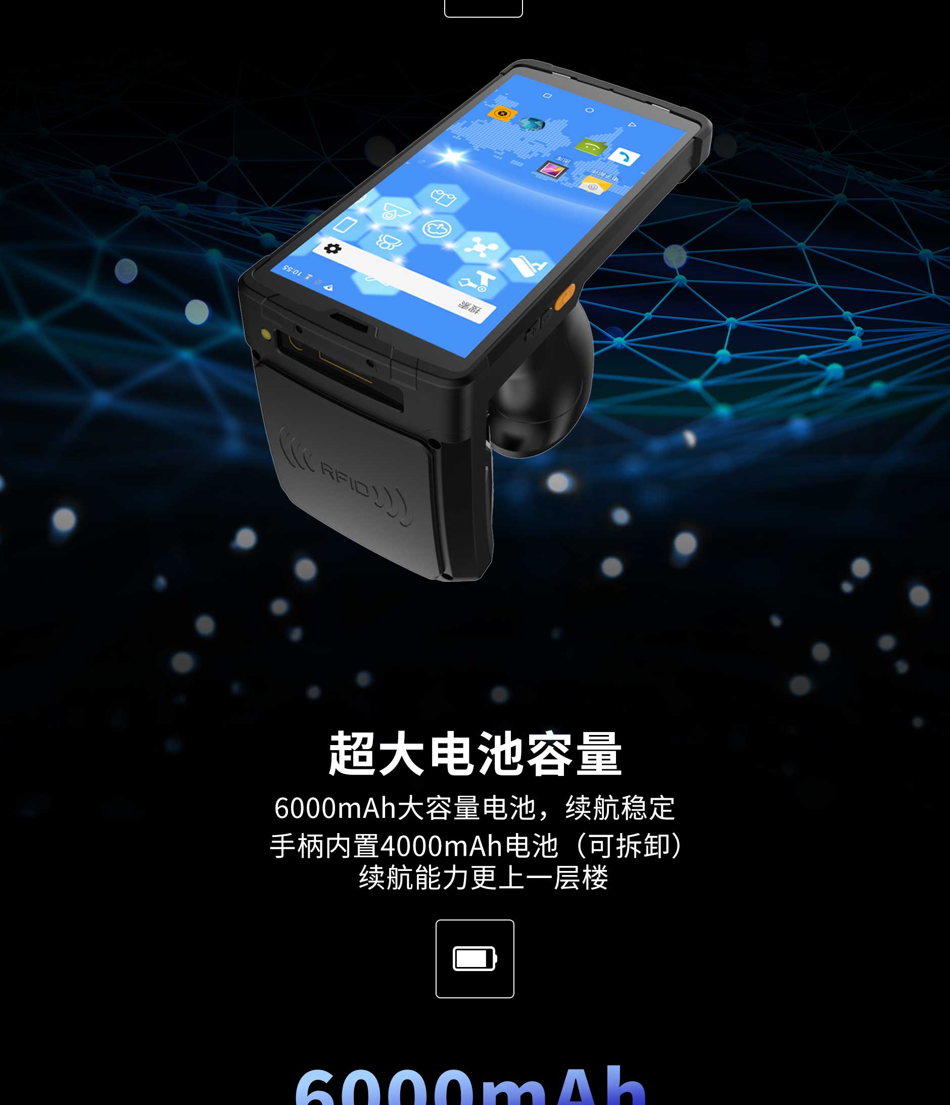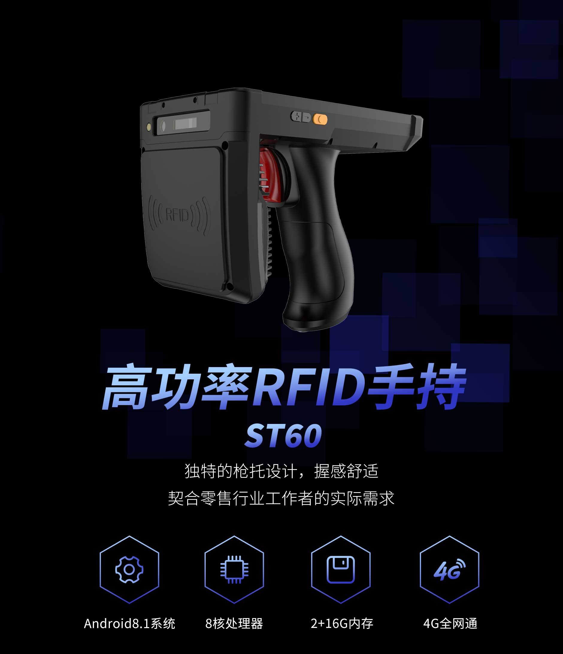 思必拓ST60超高頻RFID手持終端pdaST60 基本參數(shù)處理器8核 2.0GHz操作系統(tǒng)Android 8.1存儲RAM 2GB ROM 16GB屏幕尺寸6.0寸,IPS高亮屏機器尺寸160*80*15.8mm(槍柄長110mm)重量600g攝像頭后置1300萬自動對焦攝像頭,高亮度LED閃光燈,前置500萬定焦攝像頭音頻前置雙立體聲揚聲器,音量90db±3db(測試距離10cm)傳感器地磁,加