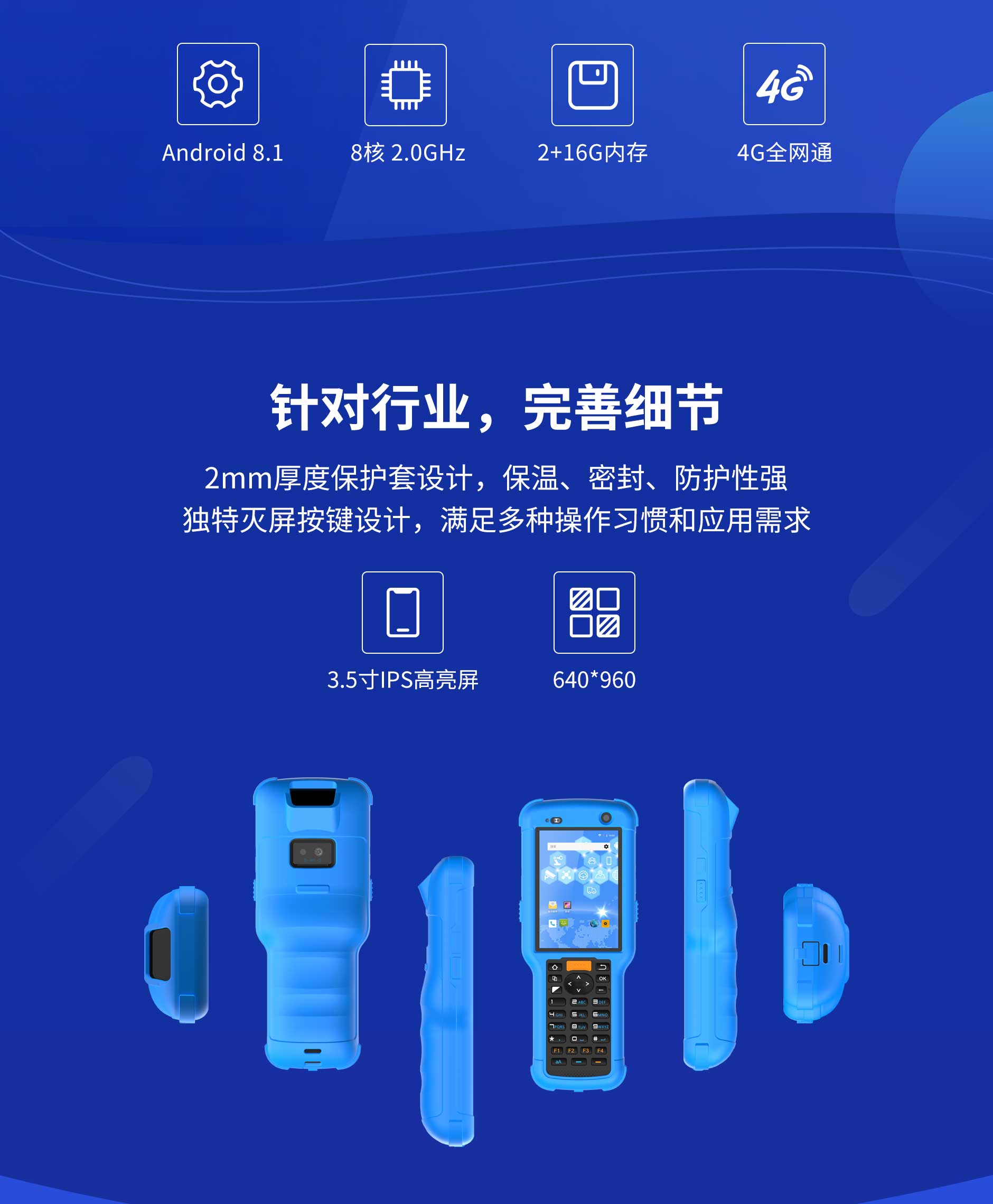SK35 基本參數(shù)處理器8核 2.0GHz操作系統(tǒng)Android 8.1存儲(chǔ)RAM 2GB ROM 16GB屏幕尺寸3.5寸,IPS高亮屏機(jī)器尺寸185*70*32mm重量300g攝像頭后置1300萬(wàn)自動(dòng)對(duì)焦攝像頭,高亮度LED閃光燈,前置500萬(wàn)定焦攝像頭音頻前置立體聲揚(yáng)聲器,音量90db±3db(測(cè)試距離10cm)傳感器地磁,加速,光感距離按鍵35個(gè)物理按鍵(包含5個(gè)側(cè)按鍵)充電方